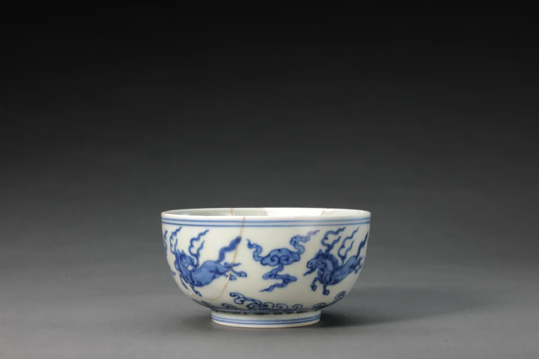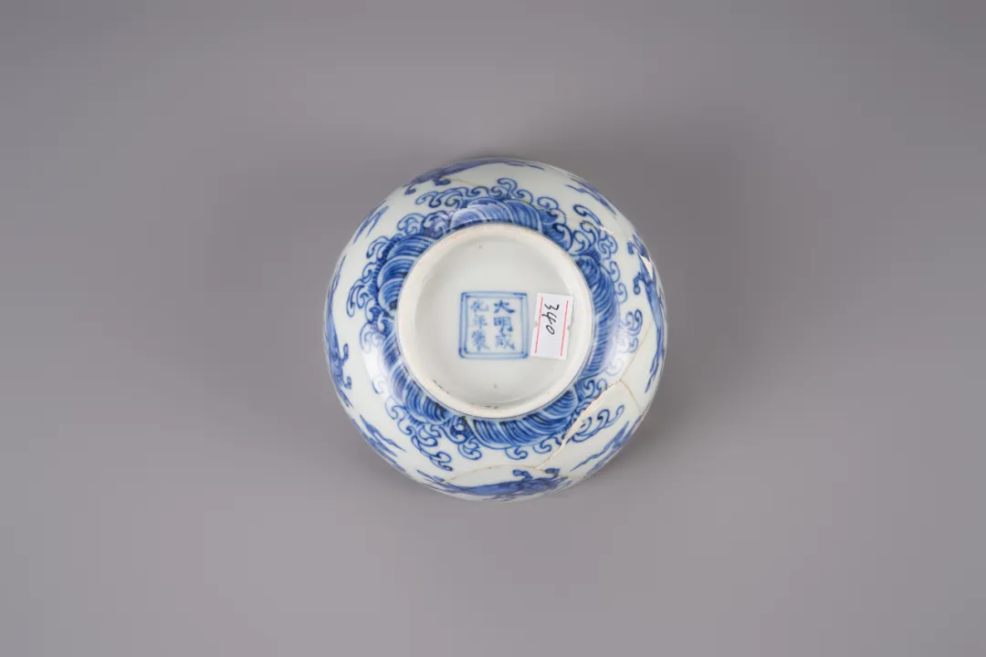 该器口微撇,弧腹,卧足。通体施釉,青花装饰,内、外壁近口沿处及外壁近足处均绘弦纹两道;碗心绘海浪纹;外壁腹部绘有四只天马并间隔祥云四朵,天马均两膊生焰,奔逐、遨游于海天之间,或目视前方或回首顾盼,有陆游诗中所谓“快哉天马不可羁”之势。其下饰一周海浪纹。碗底书青花双框“大明成化年制”六字双行楷书款。该器造型精巧圆润,胎骨致密轻薄,釉色清亮莹润,青花发色淡雅,有成化官窑后期青花瓷器之典型特征。与此同类器型传世品有绘伊斯兰花纹、勾莲纹、海石榴纹等。