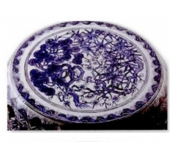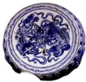 与龙纹大缸同一地层出土的遗物中,有两种纹饰非常特别。一是口径64厘米的青花大盘,盘心画一圈寿山福海,在寿山福海的中间画松竹梅。松竹梅纹是中国传统绘画中常见的题材,无论是中国画还是在陶瓷纹样中,松、竹、梅都是并列与相互交错的形式。而这块青花大盘所绘松竹梅,大概是为了符合圆形器物构图的要求,则分别从三个不同方向生出,在不同角度看都是正面。青花松竹梅纹坐墩墩面的纹饰也是这种布局。