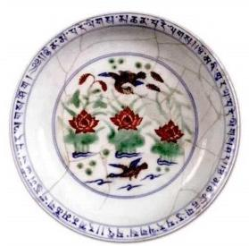 图13 明宣德斗彩莲池鸳鸯纹盘