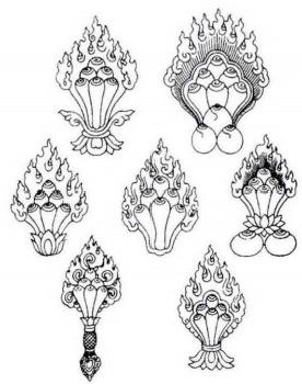 五彩钱纹坐墩(图4),器壁除上下边饰为几何开光纹外,通体以钱纹为饰,钱纹上下左右相互叠压,形成一组完整的图案。钱作窄缘广穿,外廓填黄,穿内用红彩勾画桃花花瓣,以青花圈点花蕊和描绘桃叶与叶脉,叶内填绿。墩面图案十分罕见,用矾红画一梭形器,四周随形饰以黄彩,上端的黄彩中还用矾红勾画类似穗子状的饰物,穗子上是红彩绘的火焰,腰间束有青花丝带。黄色穗子使笔者联想到西藏僧侣帽上的“孜夏”-—-用羊毛编成的黄色穗子,而火焰很像佛教背光图像中的火焰纹。于是笔者就从佛教资料中去寻找答案,觉得它与一种叫“多面如意宝”的法器相类似。“多面如意宝”的形式呈多样化,但组成元素基本是如意宝主体、穗子、火焰、束带(图5)。墩面图案是由四个“多面如意宝”组成十字形,与十字金钢杵构图一样,这种装饰纹样不仅是佛教艺术的重要元素,也是中国文化的表征。佛教中司法器者应以“宁动千江水,不动道人心”来自我警惕,令本有的佛心自性之光显现。这种五彩桃花钱纹坐墩还有没加彩就被淘汰的半成品(图6)。