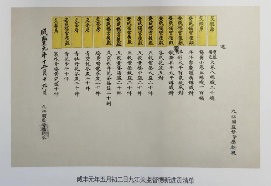 同治时期任职九江关监督最久的是景福,同治七年任至十年,也是最为忙碌。烧造的瓷器品种件数也最多,主要是同治七年八年陆续解京验收的黄地金喜字百碟碗等10072件同治皇帝大婚用瓷。