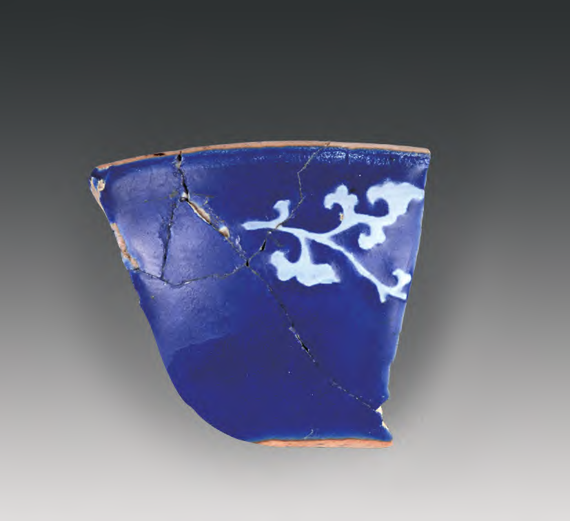 蓝地白花匜1件(F12∶230)。残片。内外壁施霁蓝釉,用白瓷泥直接在蓝釉表面堆画折枝花卉。内口沿釉面毛糙,有粘连迹象。高5.3厘米(图十一、十二)。