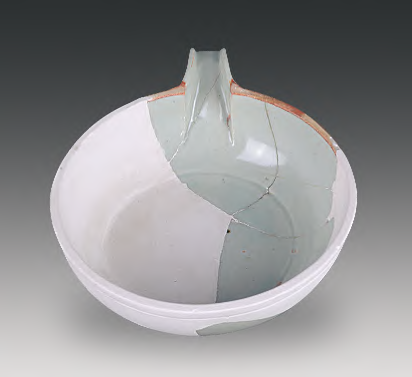 青白釉匜1件(T3H5∶301)。芒口,局部略有凹凸,似为垫烧物不平所致,浅弧壁,涩底较平。器壁高度三分之二处开梯形小口,镶接梯形短槽流,短流上沿与器壁连接处高度与芒口一致, 但此处涩胎痕迹超出芒口圆弧之外,短流向外斜出后渐升高回落呈弧形,其最高点超出芒口高度,短流下沿与内壁连接处稍有转折,短流下端以泥条卷曲一圈作卷云状空心小系。口沿下饰一周凹弦纹,足部线条自然,足、底无修坯痕迹, 内壁非水平方向加工痕迹明显。内外均施青白釉,短流口上下均有积釉现象,外壁两侧积釉较多,底部沾有少量釉料。口径 15厘米、底径 10.3厘米、高 4.7厘米(图四~六)。