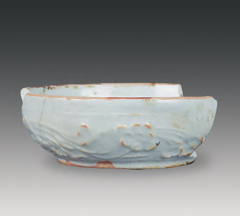 20世纪80年代在落马桥窑址进行的发掘中, 于元代地层内出土了一件青花菊纹匜(图十九),其口径13.6厘米、底径8.7厘米、高4.5厘米,短流低于器物芒口高度,涩底无釉,芒口局部有受压而凹凸不平的现象,口部弧线呈内外扭曲状,但芒口始终处在同一水平面上。这种口部在同一平面内扭曲,应是烧成时芒口局部不能同步收缩所致。
