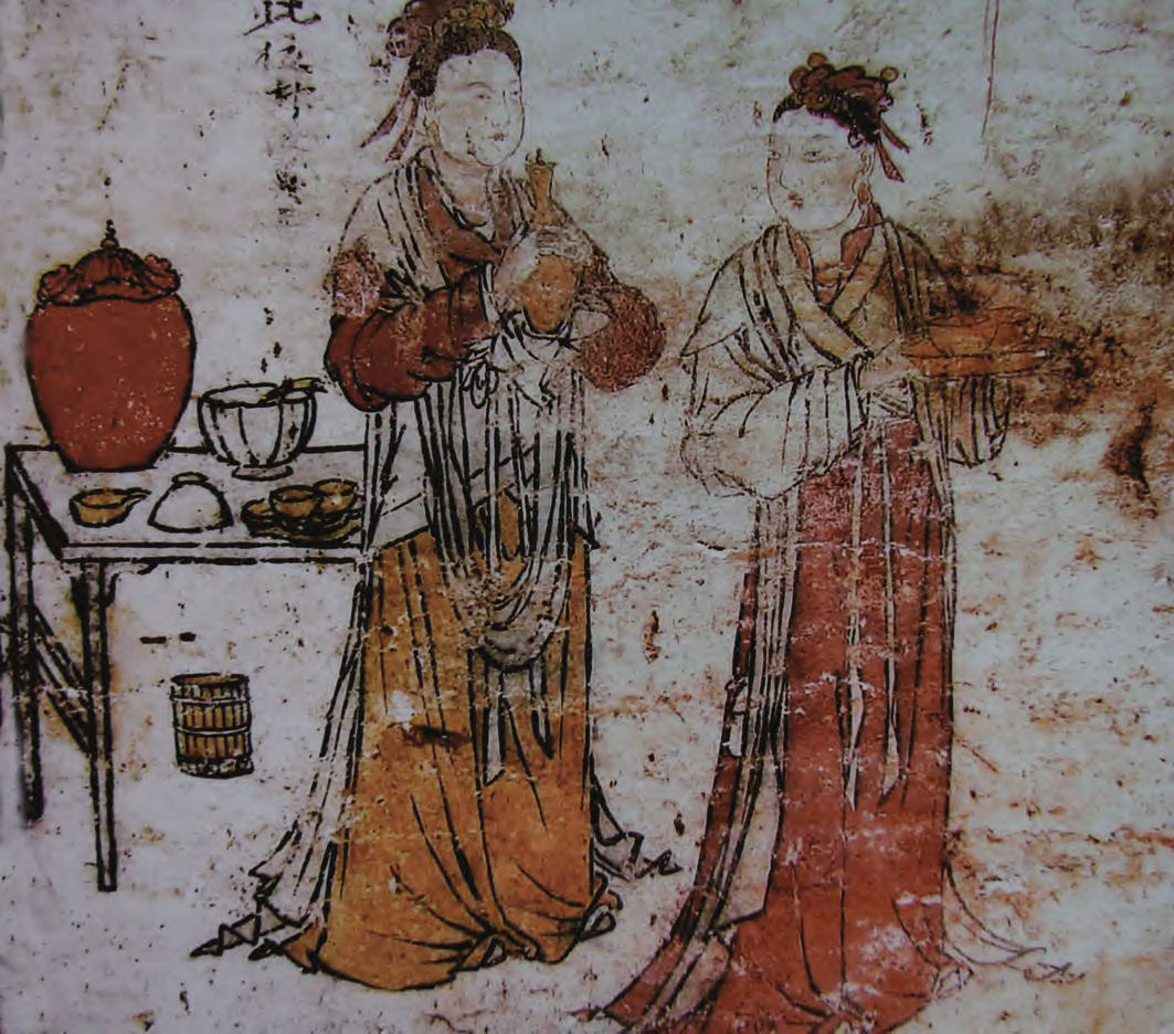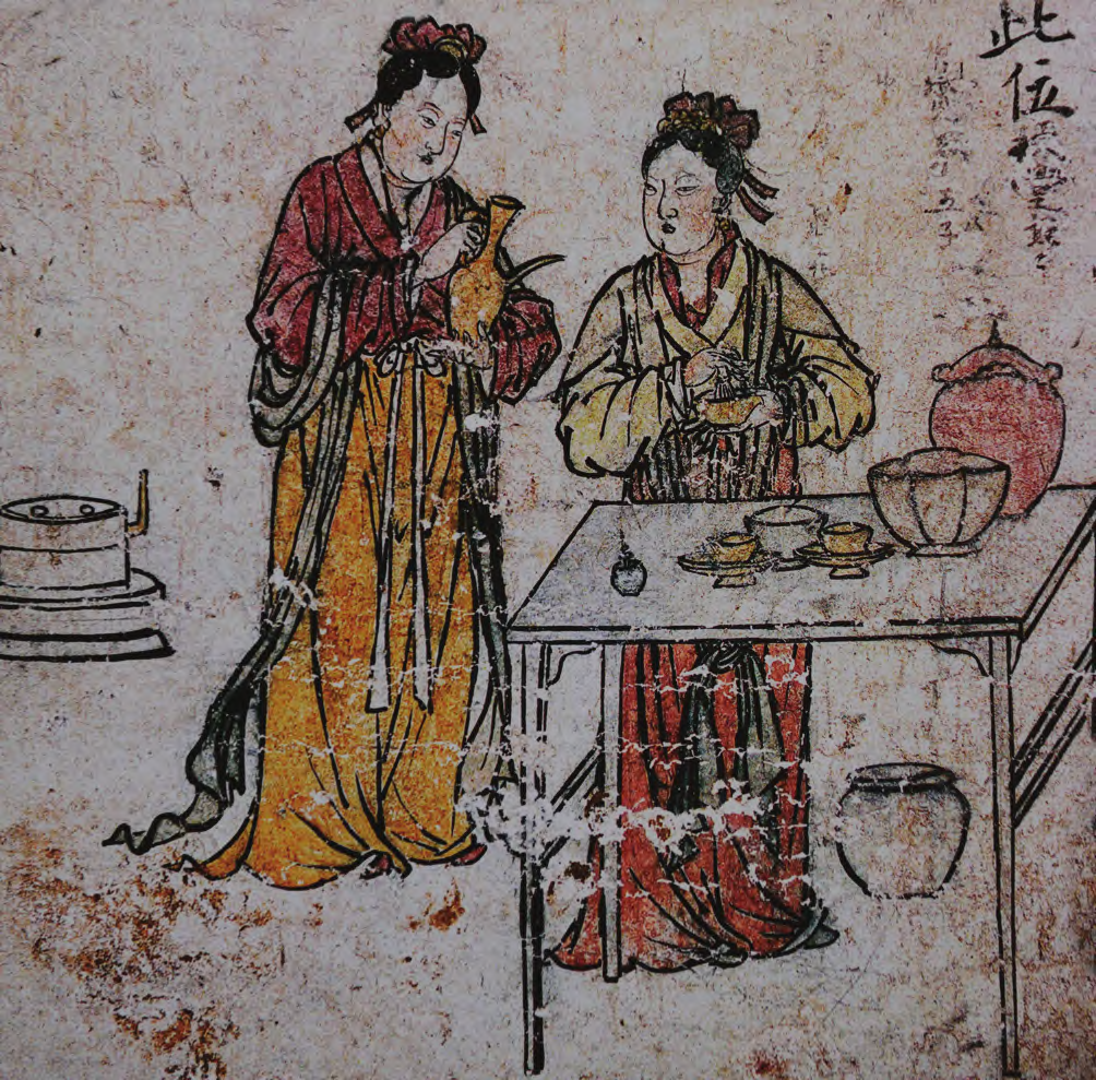 鉴于落马桥窑址出土瓷匜大小不一, 小者极小,作为暖酒之物似乎无从着手,其是否作为温酒器使用还需做进一步论证。笔者根据山西屯留元代壁画墓侍女备茶图的图像资料以及《居家必用事类全集》、《饮膳正要》等文献资料,推测瓷匜是调和搅拌茶、酒的容器。此观点希望能抛砖引玉,引起学者对瓷匜功能的关注。