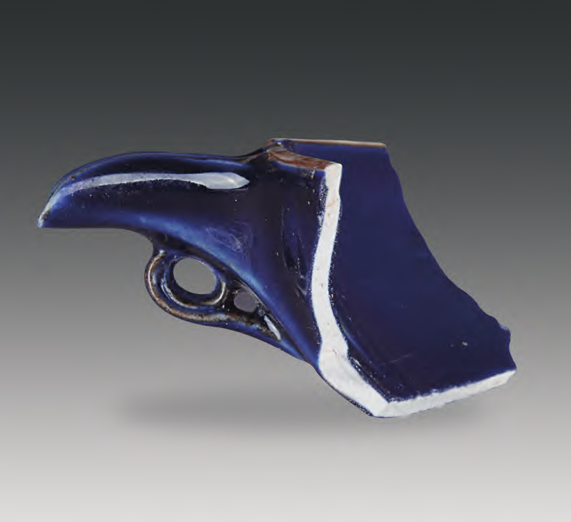 霁蓝釉匜2件。标本 T3H1∶1,缺流。芒口,弧壁,涩底较平无垫烧痕迹,足部微外拱,弧线自然无修坯痕迹。足部釉面线条呈多边形转折,无人为起釉修刮痕迹。底径7.8厘米、高4.7厘米(图十三、十四)。标本T3H1 ∶ 15,器身大部缺失。器壁一侧斜出镶接梯形短槽流,短流上沿与器壁连接处低于芒口高度,短流下端以泥片重叠卷曲两圈作卷云状空心小系。短流口沿、芒口弦纹处积釉均较厚,呈色较深。短流长3.5厘米、流口宽1.7厘米(图十五)。