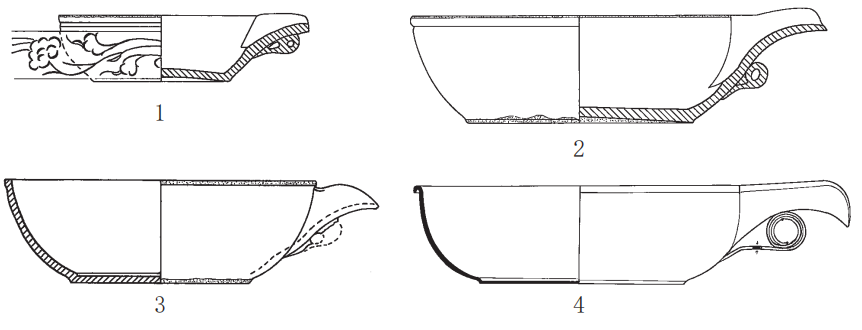 标本 F12 ∶ 179 属于Ⅲ式,高 4.7 厘米,短流最高点高 4.6 厘米, 短流与器壁连接部位高 4.5 厘米(图二三 ∶ 3)。测量数据显示,其短流降低了 0.2 厘米与器壁镶接,假设在不改变短流形制的情况下,短流与芒口水平镶接, 短流最高点高为 4.8 厘米,形制就与无锡元墓出土带系银匜一致(图二三 ∶ 4),短流最高点仅高出芒口高度 0.1 厘米。