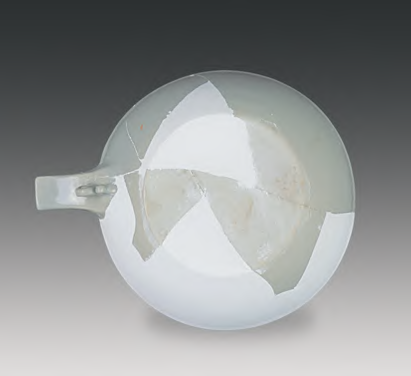 从外壁足部釉面线条呈多边形转折推断,外壁是以淋釉法施釉,即瓷匜坯体口朝下悬空置放,施釉工匠拿装有釉料的容器,淋向坯体足部作直线小范围转折, 而不是转动坯体,让釉料淋在足部,所以足部釉面留下的是多边形转折而不是圆弧形。当淋釉角度和力度稍有偏差,釉料就会冲向足底,故底部又有沾上釉料的可能。瓷匜底部朝上施釉时,短流外壁近乎平面,故该处积釉较明显。当内外壁满釉后,根据装烧需要, 工匠把瓷匜圆口上的釉料刮除,露出坯胎,足部有积釉却不清理。