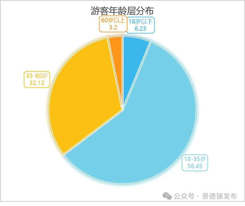 18岁以下未成年游客占比6.23%,多以家庭亲子游形式到访;18-35岁青年客群占比58.45%,是景区景点消费活力的核心来源,涵盖了追求潮流体验的年轻群体;35-60岁中年及中老年客群占比32.12%,兼具休闲度假与文化探索需求,消费能力稳定;60岁以上老年游客占比3.20%,更倾向于慢节奏的观光游览。