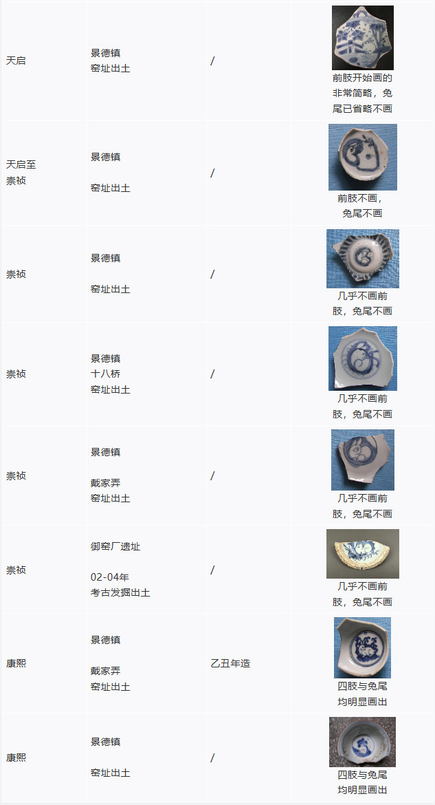 由铺助纹饰来看,嘉靖朝兔纹多以器心青花双圈中绘制兔纹,青花五彩兔纹目前仅见器心与器壁绘开光形式兔纹,兔纹以红色留白,四周圈绘一层绿彩,最外以青花勾出开光式样。万历朝多见兔纹藏于山石之中的纹样,山石四周衬以花草、灵芝等纹饰,兔纹多为“抬首望明月”之状,开光兔纹在万历外销瓷上多见,另也多见兔纹与仕女同绘。天启兔纹也有与人物同绘者,但这时兔纹并非主题纹饰。以兔纹为主题的天启青花瓷,兔纹往往与桂树同绘,但是有白描、细绘与粗绘这三种绘制手法的区别。崇祯兔纹从出土情况来看数量很多,但以铺助纹饰来区分仅有兔纹外三圈青花外加锯齿纹兔纹、兔纹外四圈青花外加变形葵瓣纹、兔纹加外单圈青花,无其它装饰以及兔纹外加双圈青花四种,其中兔纹加双圈青花又可分无其它装饰与双圈之外绘简单花草纹两种。崇祯朝兔纹一反天启朝皆与桂树同绘的式样,构图均无与桂树,这一点值得注意。碗心纹“佛手”式草丛,草丛中伏有一兔,这种纹饰仅在顺治朝得见。康熙兔纹铺助纹饰多样,兔与人物同绘的构图、兔独倚于一栅栏之旁的构图、青花双圈中绘山石之上伏有一兔的构图、兔与灵芝同绘的构图都很常见,但将兔与柳树、竹枝、菊花同绘的仅在康熙朝得见。(见表1:明清景德镇民窑兔纹绘制演变示意简表)