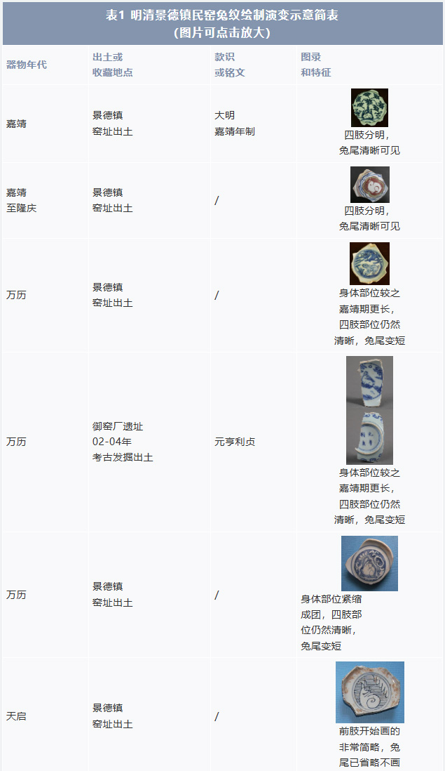 以兔纹形态来看,嘉靖朝兔纹即使潦草但兔子四肢仍然绘制分明,兔尾明显可见。万历朝兔纹绘制时,表现身体部位有二种截然不同方式,或者与嘉靖朝比较起来更加修长;又或者完全紧缩成一团,但四肢部位都仍然清晰,但兔尾已开始变得略短,有的甚至已经省略兔尾不画。从天启朝开始到崇祯朝,绝大多数兔纹已不画兔尾,兔纹于前肢开始画得较为简略,有些兔纹几乎不画前肢,只强调后肢。到康熙朝,兔纹才又重新恢复“四肢俱全”的状态,而且兔尾也不再被“忽略不计”,省略者亦有,但为数不多。