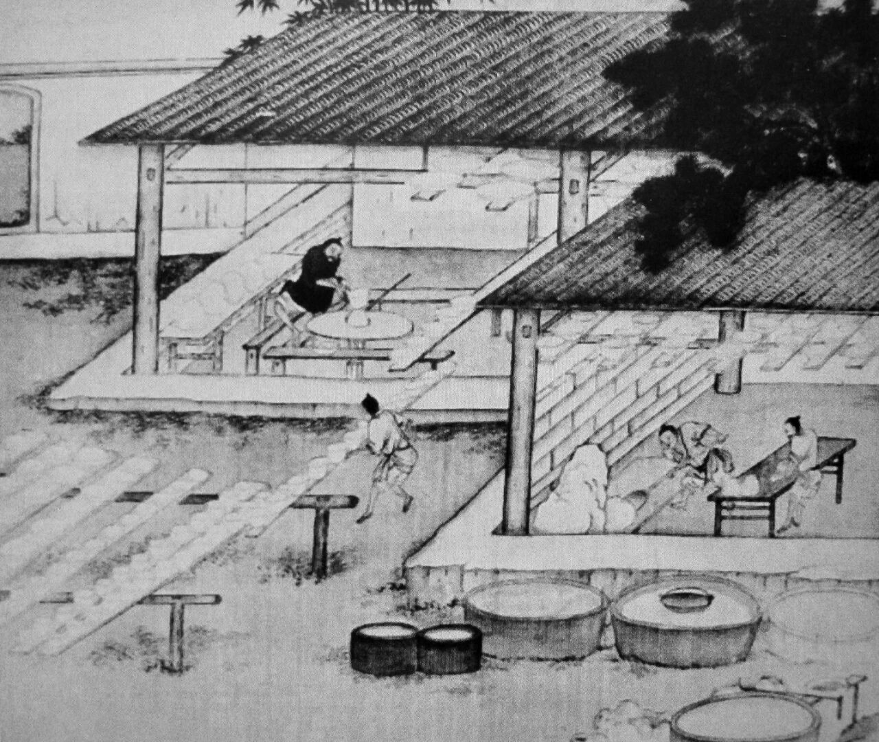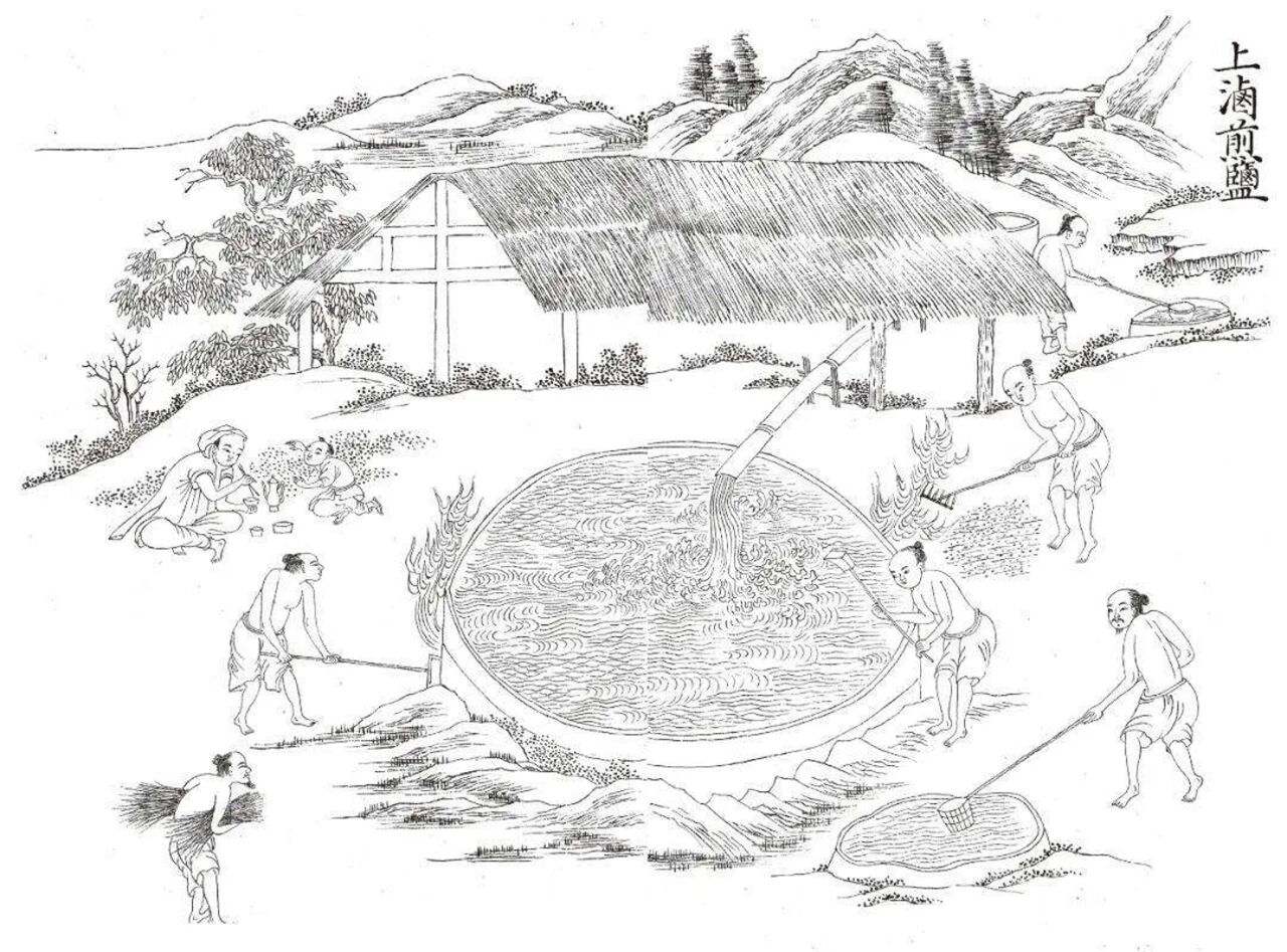 在古代文献中,有些事物不容易用文字表述清楚,或者为了直观地表达作者的意图,就会使用图像的形式来进行补充。“图,经也,文,纬也”,这种“一经一纬,相错而成文”[1]的表现形式出现于各类文献之中,如:我国最早的手工业技术文献,春秋时期的《考工记》,就有各种工具的插图。之后北魏时期的《齐民要术》、元代的《农书》、明代著名的《天工开物》等科技文献,都大量使用插图来对文字内容进行补充和诠释。文学作品也不例外,元、明时期出现了各种绘图与全像古今小说。在此基础上,又出现了以多幅画面,连续表现一个故事或事件的发展过程,并配有相应的文字,来传播知识的又一种文献类型。这类图文并茂的文献中有影响大、流传广的南宋《耕织图》(图1)、元代描绘煮海制盐的《熬波图》(图2)、清初介绍海南黎族生活的《琼黎风俗图》(图3)以及唐英等人的《陶冶图》……本文就院画本《陶冶图》的版本及其影响作一考证。
