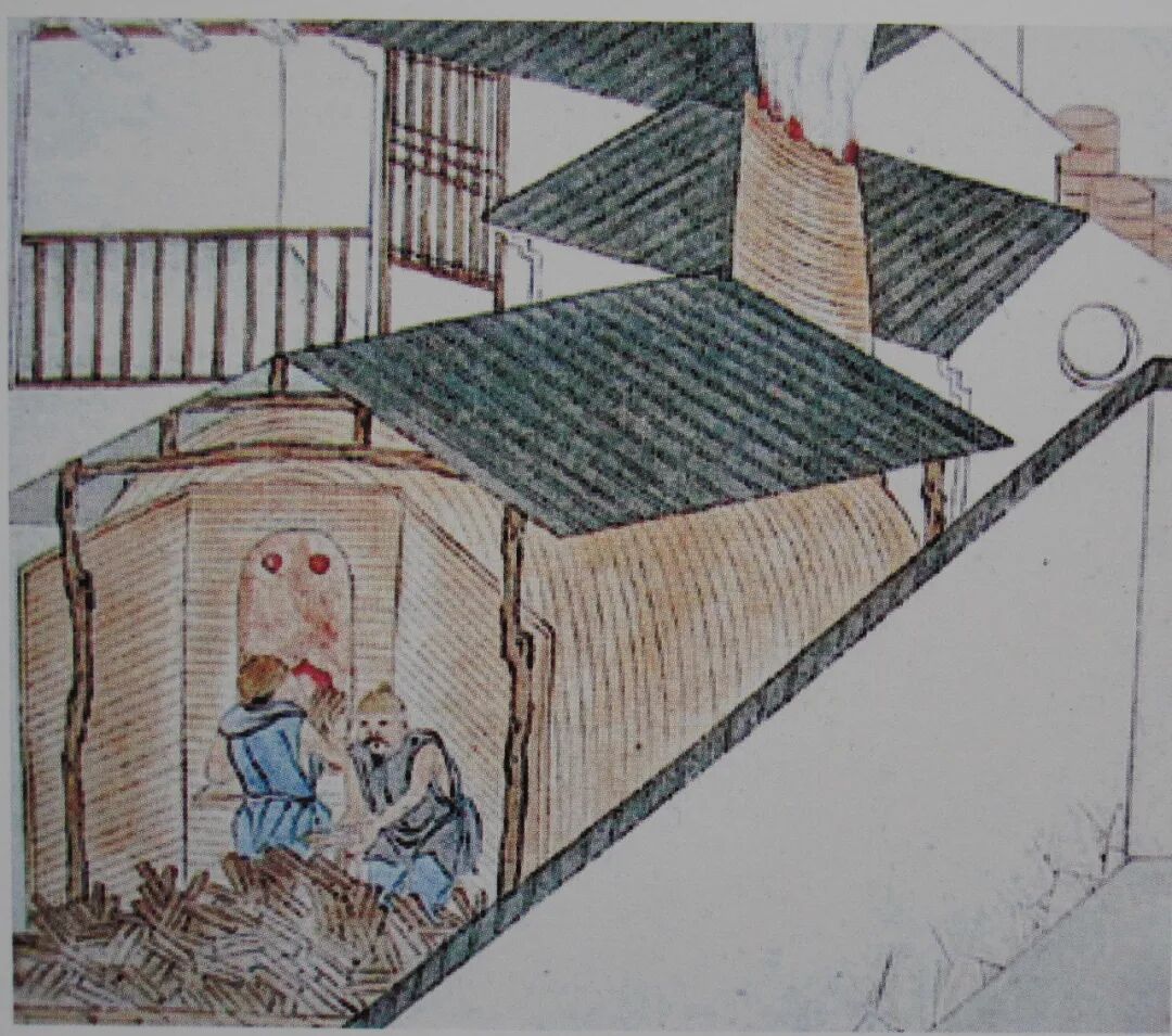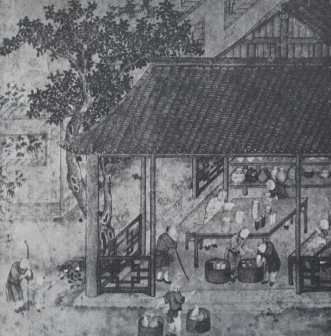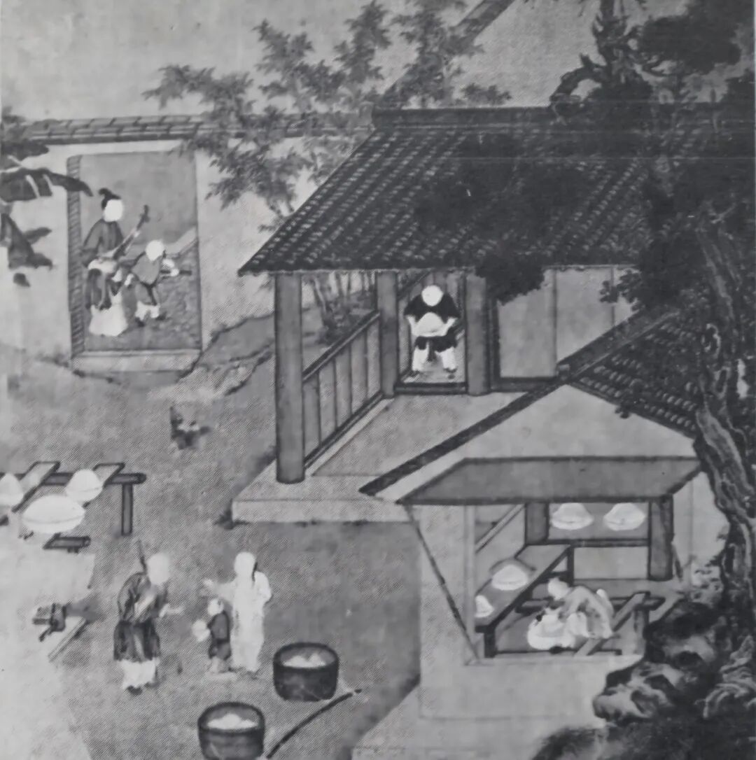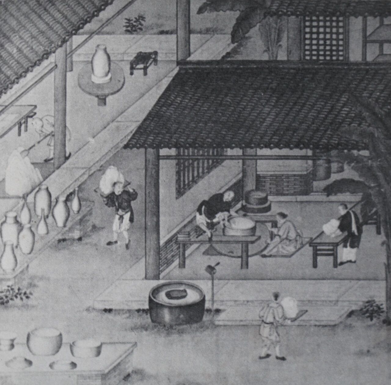另有一幅“琢器修模”,其名目未见于唐英的《陶冶图说》,而且制瓷工艺中琢器无须过模,所以并没有这一工序。从画面上看,室外晾晒着许多瓶、罐,室内是一男子在辘轳车上拉坯,坯件是大缸,该图应该是“琢器造坯”的又一版本(图7)。