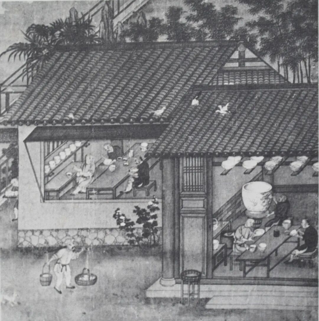 “制画琢器”一幅则图、名不符,从画面看,该图以各种颜色釉的瓶、罐为前景,主室中,一人坐在辘轳车前,为一大罐修坯;另室,一人正在拉坯,所拉大罐几乎成型;画面右侧,一人左手抱瓶,右手使笔;另一人正专注于身前画有图案的大瓶,似乎是画坯的情景。但,熟悉景德镇画坯的人都知道,绘制大瓶时,大瓶都是放在专用的木架上,身旁要有画案,以便放置多管毛笔和盛颜料的碟子。而画面上抱瓶男子身旁是一木凳,凳上放有一盆水。另一人怀中放着盛有液体的木盆,大瓶是置于一大木盆内,身旁还有一大缸。这种画面表现的应该是补水和施釉的场景。《收藏展》中也有这幅图,题名为“琢器造坯”,因此,《专辑》里的“制画琢器”当为“琢器造坯”之误(图6)。