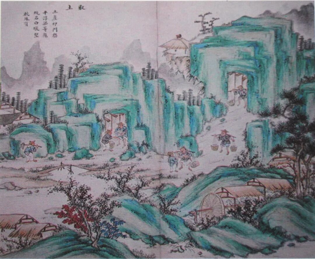 前述《专辑》中十五幅图至少有三个版本,其中:“采石制泥”、 “淘练泥土”、“炼灰配釉”、 “旋坯挖足”、“烧坯开窑”、“圆琢洋彩”、“祀神酬愿”七幅与《收藏展》为同一模本;“采取青料”这幅又与《图典》为同一模本(图5)。